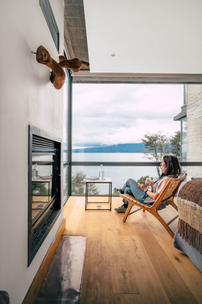 Cada habitación en Hotel AWA mantiene un gran ventanal de cielo a suelo para que disfrutes un amplio paisaje natural: el lago Llanquihue y el volcán Osorno en todo su esplendor.
